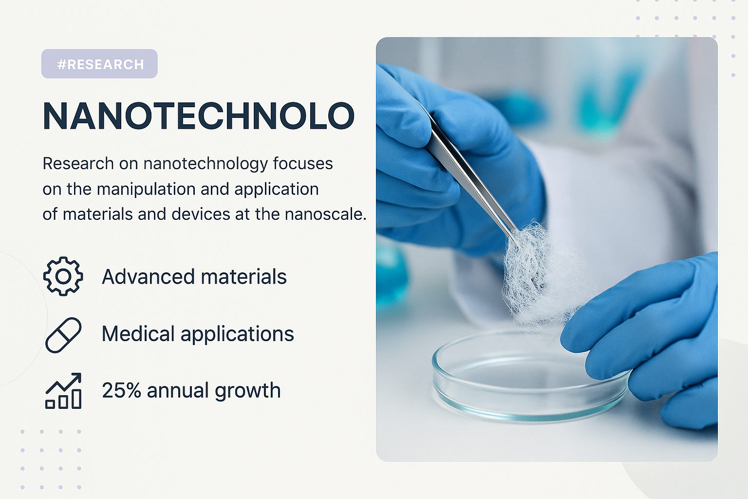 An educational infographic portraying key aspects of nanotechnology research, including applications and growth statistics, designed for scientific communication.