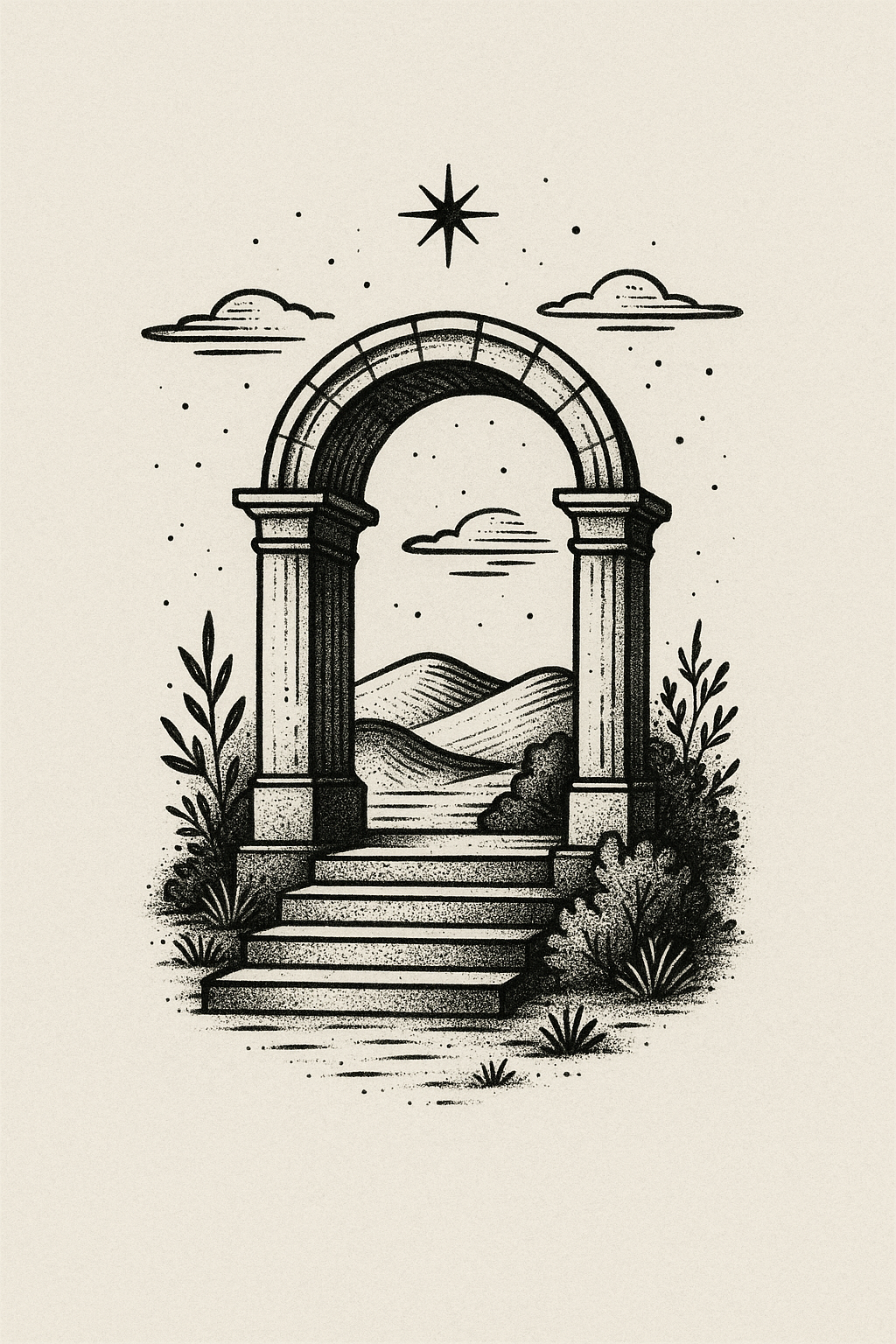This image features a detailed illustration of an archway surrounded by nature, ideal for use in art prints or digital media. It combines elements of architecture and landscape.