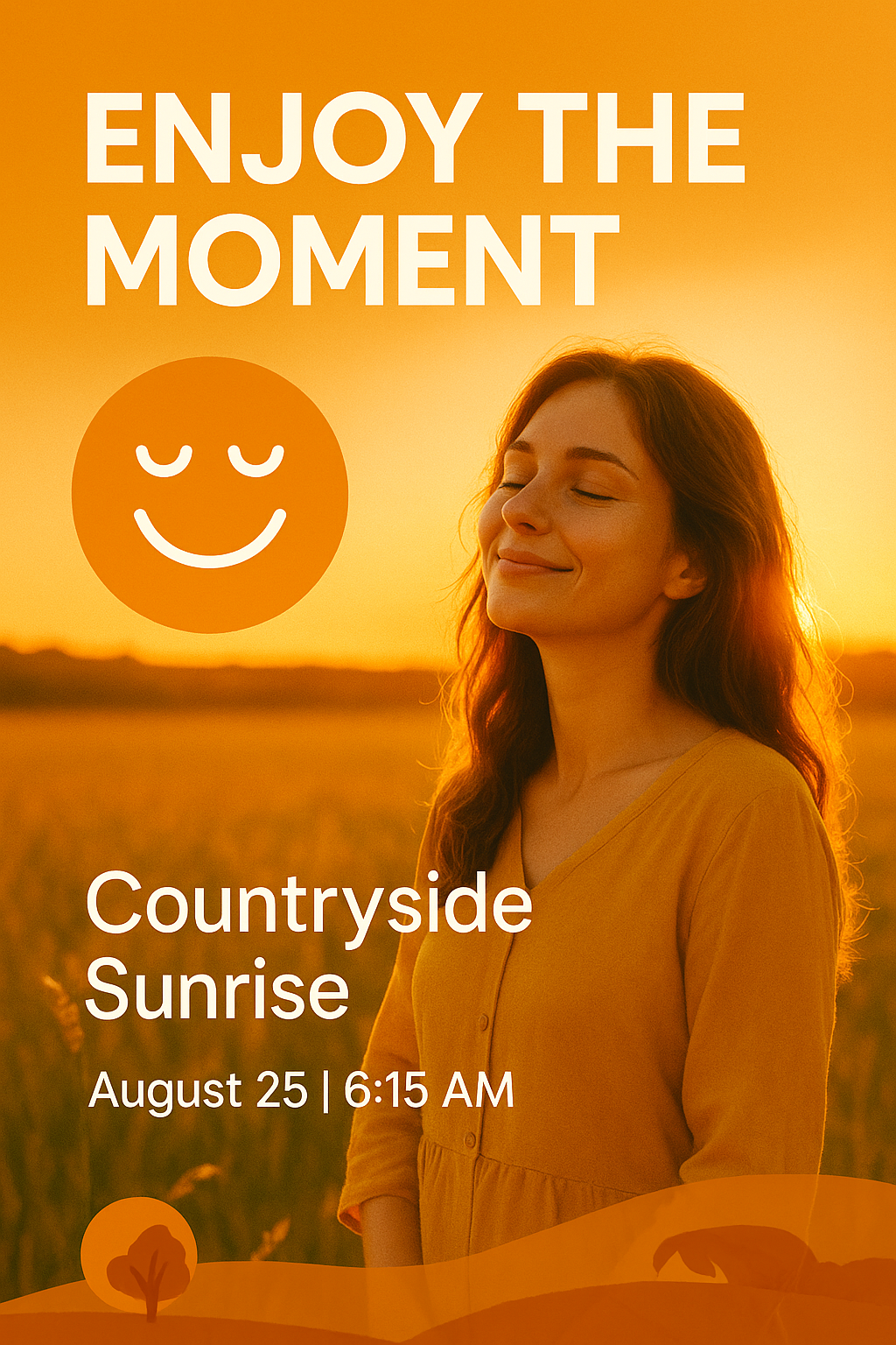 /Collection: /by davooda/Type: PNG/A vibrant social media post showcasing a serene woman enjoying a sunrise in a countryside setting. The warm color palette evokes feelings of tranquility and joy, perfect for motivational content.