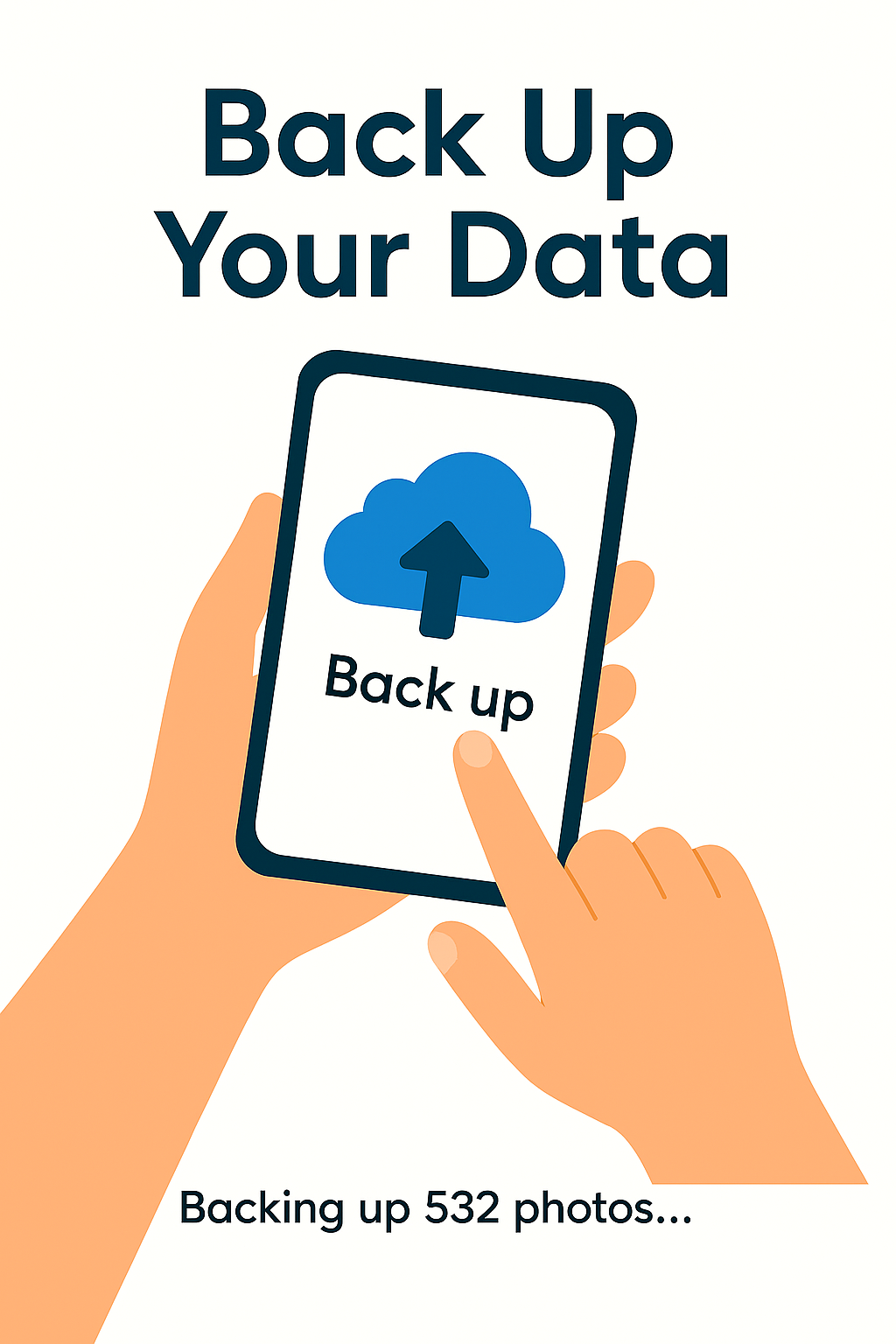 Stylized illustration depicting a mobile phone with a cloud upload icon, emphasizing the importance of backing up data. Ideal for tech-related content.