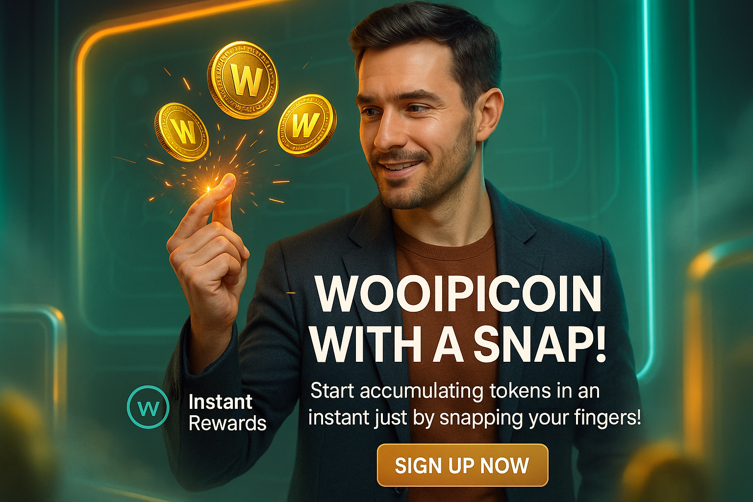 /Collection: /by davooda/Type: PNG/Vibrant promotional banner for a cryptocurrency rewards program featuring a confident man interacting with digital coins, highlighting instant rewards. Ideal for digital marketing campaigns.