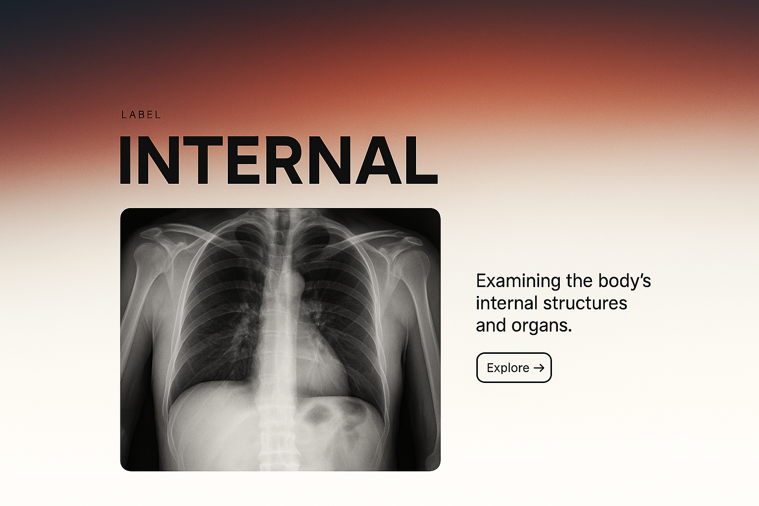A modern web design concept showcasing an x-ray image with a bold label 'INTERNAL'. The layout includes a clear text block and an action button, set against a gradient background.