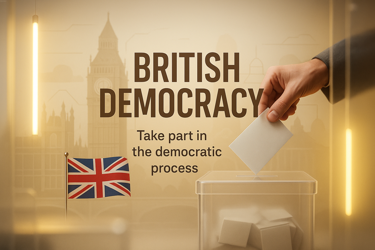 /Collection: /by davooda/Type: PNG/Illustrative image promoting participation in the democratic process in Britain, featuring a hand casting a vote. Ideal for political campaigns, educational content, and civic engagement.