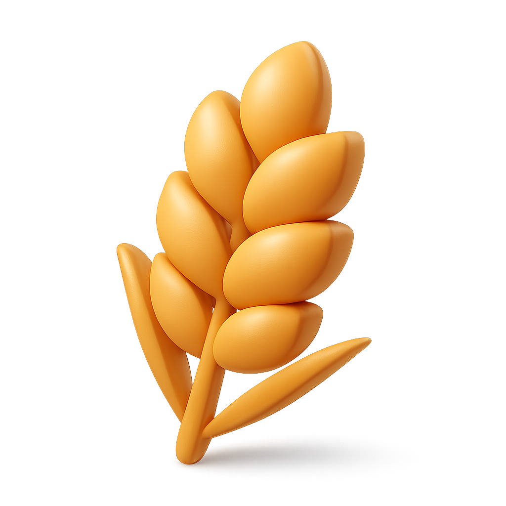 A vibrant, stylized icon of an ear of grain rendered in 3D. The design features smooth, rounded grains in an appealing orange hue, set against a subtle gradient background, enhancing its three-dimensional feel.
