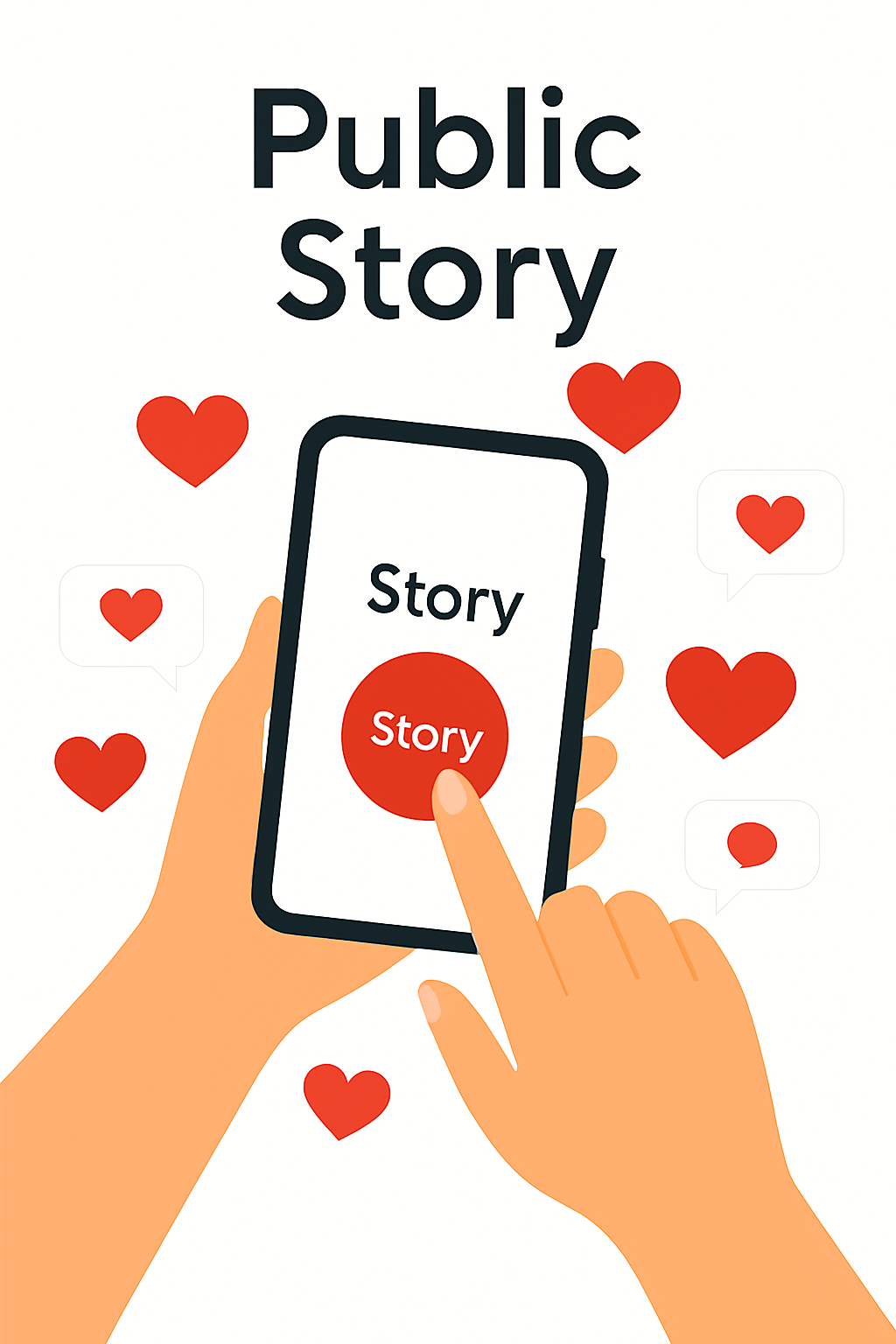 /Collection: /by Sergey Leonov/Type: PNG/Illustrative graphic depicting hands interacting with a smartphone featuring a public story interface, ideal for social media marketing and engagement campaigns.