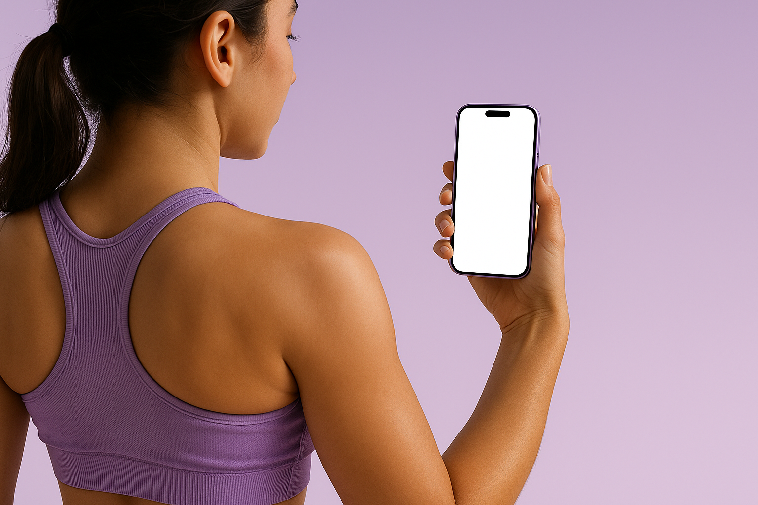 A yoga instructor in a purple athletic top holds a smartphone with a blank screen. The image captures her from behind, showcasing a dynamic pose against a soft purple background.