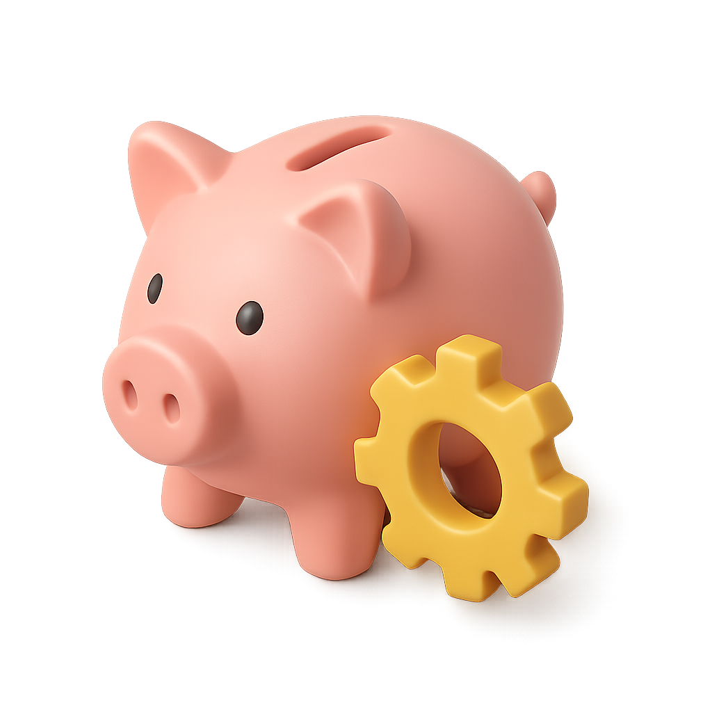 A 3D illustration of a pink piggy bank alongside a yellow gear. The piggy bank is depicted in a three-quarter view with a transparent background, emphasizing its volumetric design.