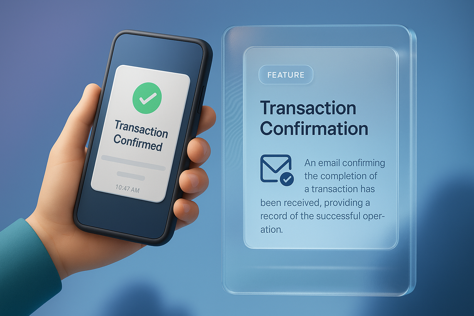 A person is holding a smartphone displaying a transaction confirmation email with a checkmark. The background features a smooth gradient, enhancing focus on the device and the confirmation.