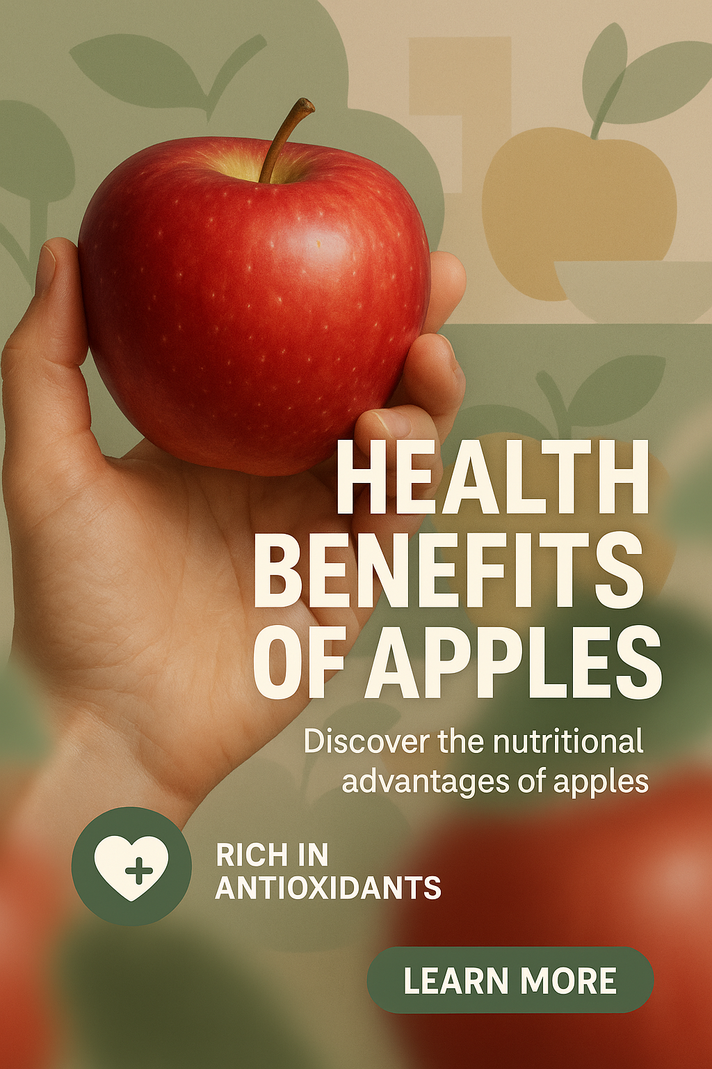 A visually appealing infographic highlighting the health benefits of apples, featuring a hand holding a red apple, perfect for health and wellness promotion.