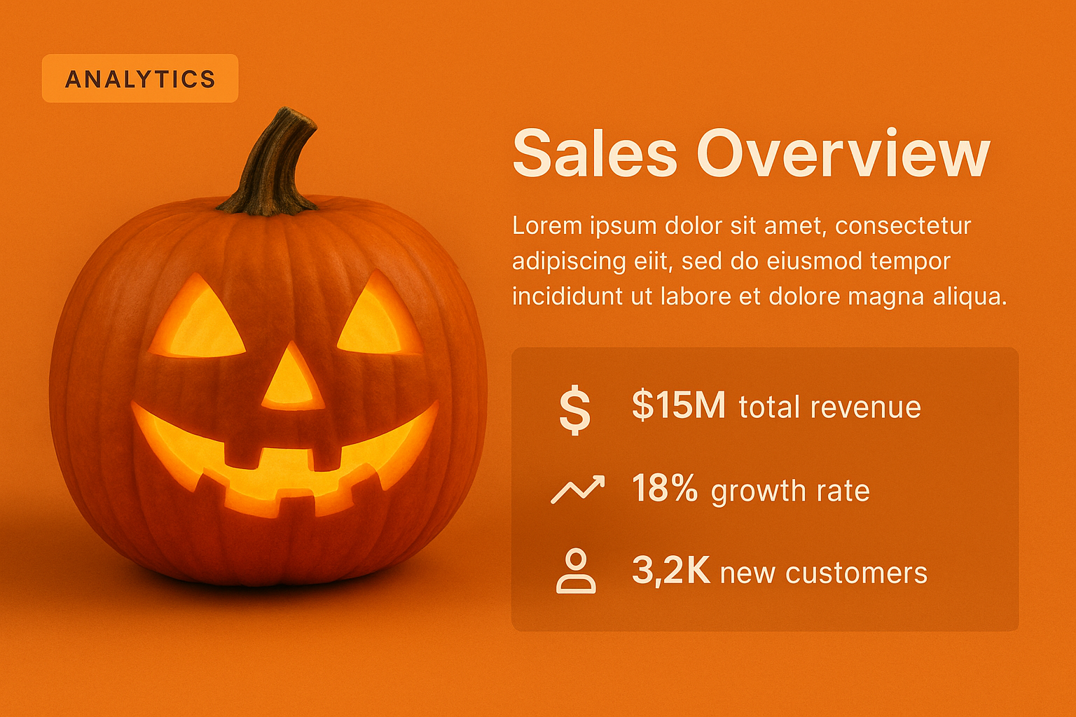 A festive sales overview graphic featuring a carved pumpkin. The design combines seasonal elements with analytical data, ideal for marketing presentations during Halloween.