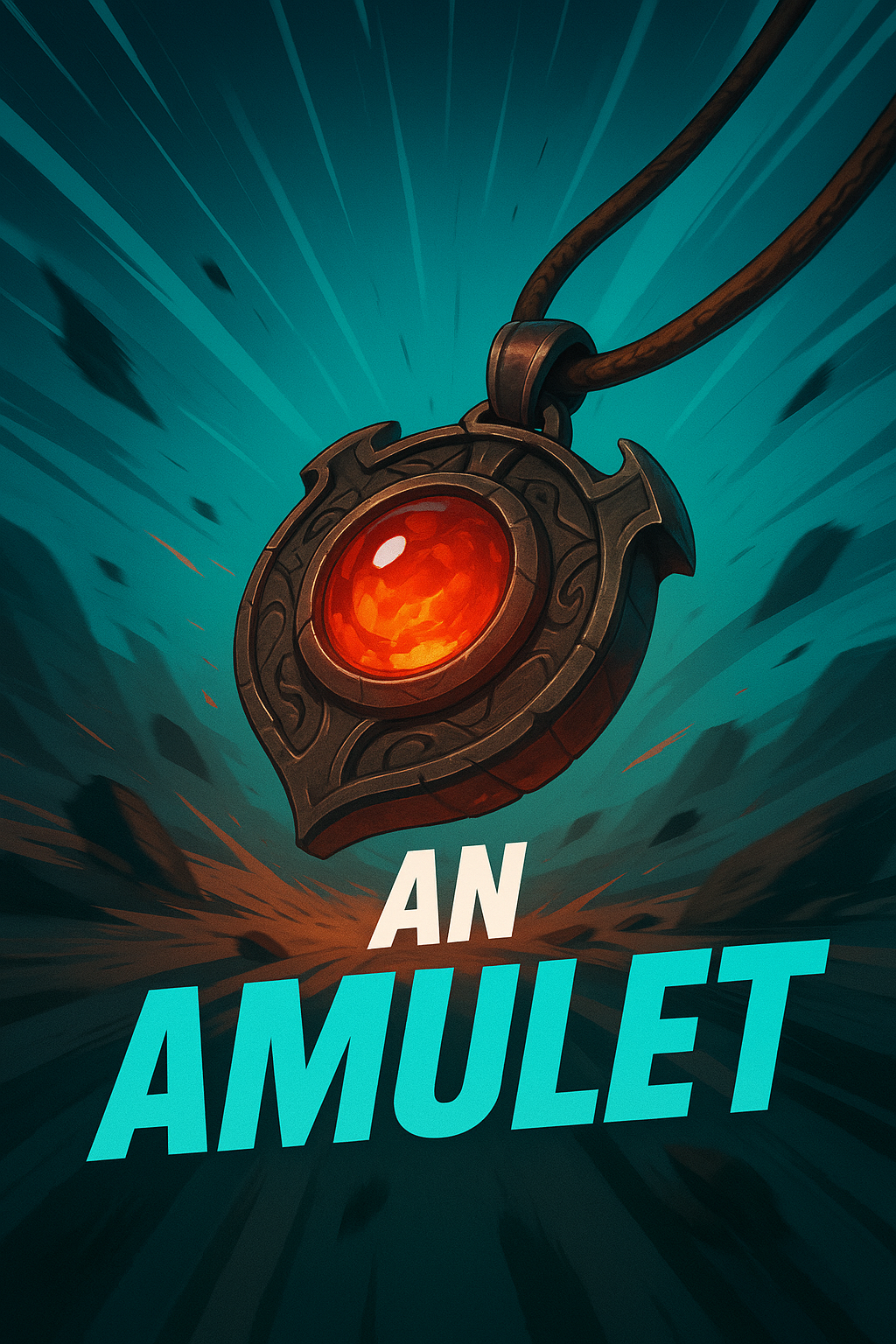 A striking 3D illustration of an amulet featuring a vibrant orange gemstone. The background has dynamic lines emanating from the center, creating a sense of movement and energy.