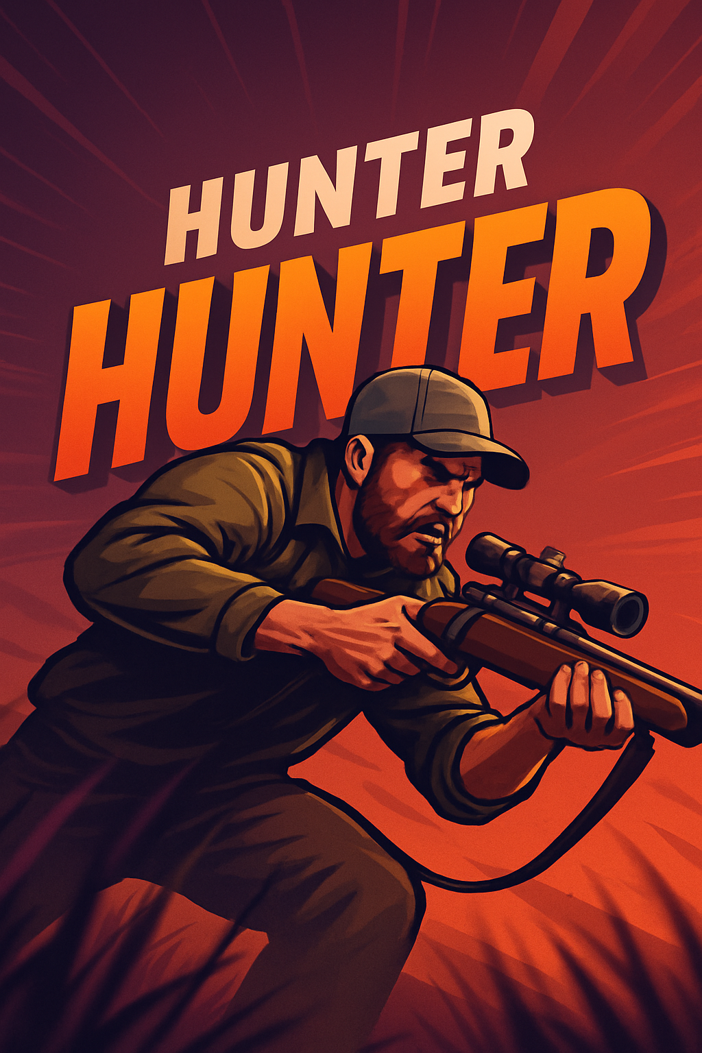 An action-packed illustration of a hunter aiming with a rifle, featuring bold typography. The background is a gradient transitioning from deep red to orange, enhancing the dynamic feel.