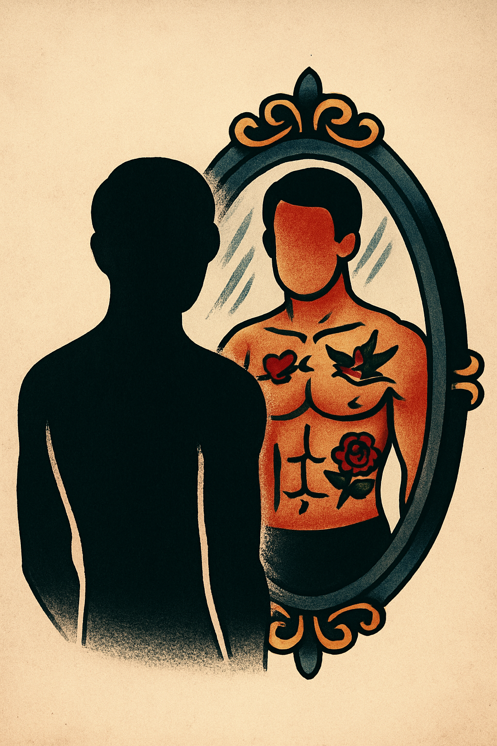 The image features a silhouette of a person standing in front of a mirror. The mirror reflects a body adorned with colorful tattoos on a light beige background.