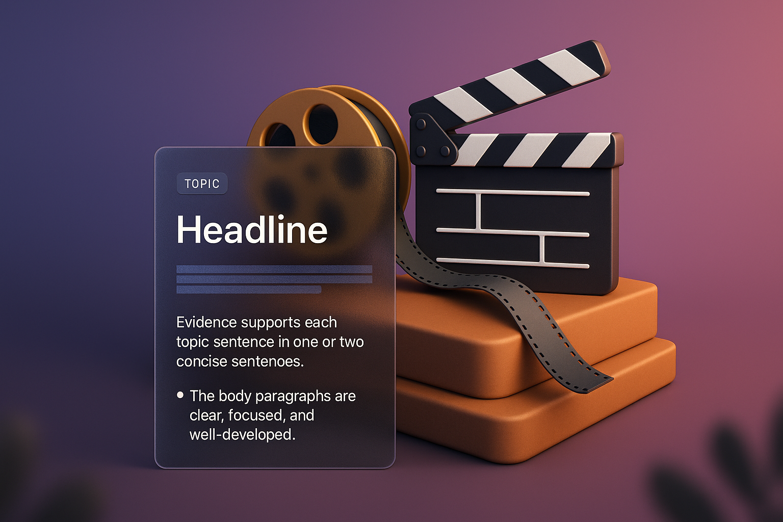 A vibrant 3D illustration featuring layered blocks with a film clapperboard and reel. The design includes a transparent label with a headline and supporting text, creating a visually appealing layout.