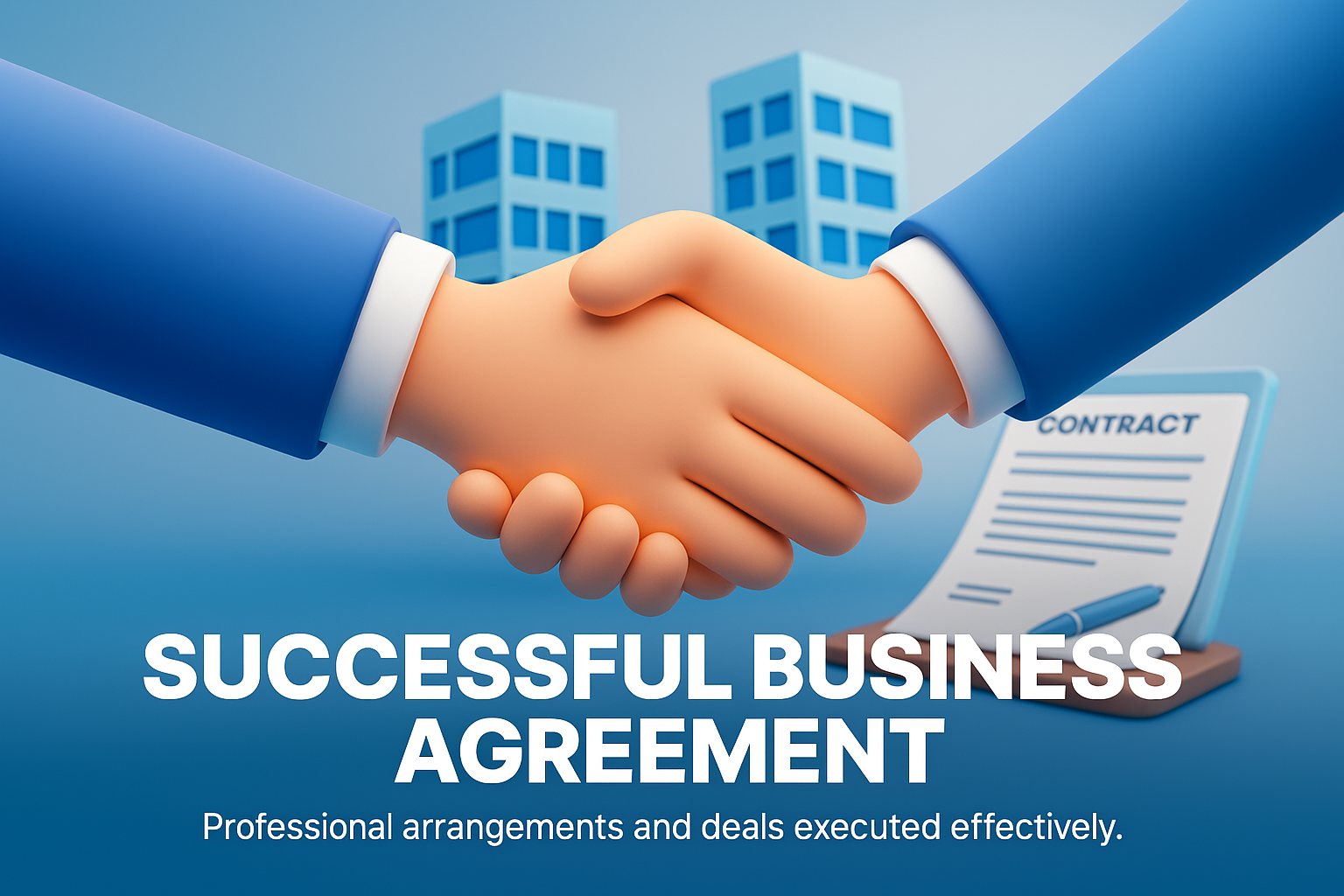/Collection: /by davooda/Type: PNG/A close-up of a handshake symbolizing a successful business agreement, set against a blurred cityscape background. The text reads 'Successful Business Agreement' in bold, clear font.