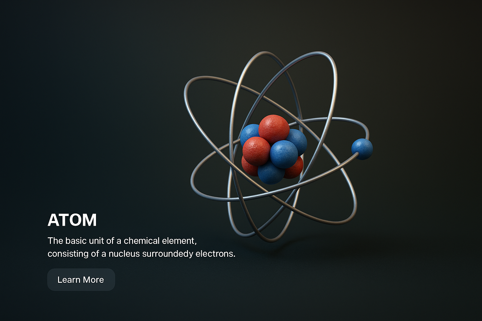 /Collection: /by davooda/Type: PNG/A detailed 3D representation of an atom with a dark gradient background. The scene includes a nucleus surrounded by electrons, accompanied by informational text and a call-to-action button.