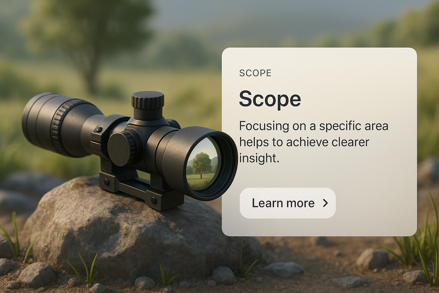 A detailed 3D illustration of a scope positioned on a rock, featuring a smooth gradient background. The scene highlights a clear label and an action button for user interaction.
