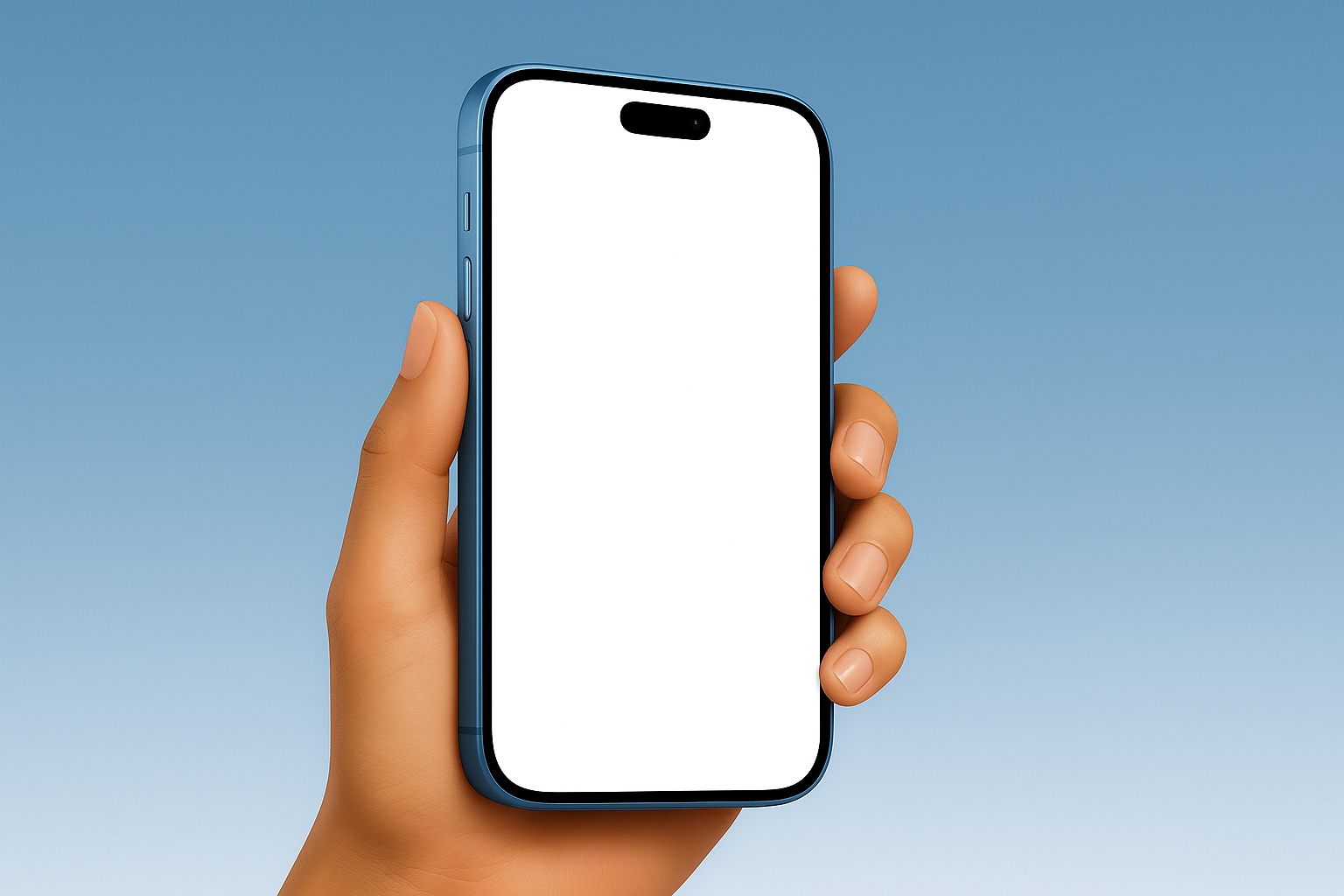 A blue smartphone is held in a hand, showcasing a blank white screen. The phone has rounded edges and is presented against a smooth gradient background with a shadow on the right.