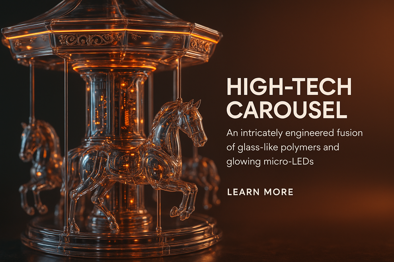 /Collection: /by davooda/Type: PNG/A stunning close-up of a futuristic carousel, crafted from glass-like polymers, showcasing intricate details, glowing micro-LEDs, and metallic reflections under soft cinematographic lighting.