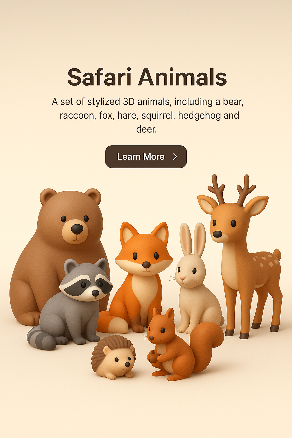 A vibrant 3D illustration featuring a bear, raccoon, fox, hare, squirrel, hedgehog, and deer. The animals are stylized and arranged attractively on a gradient background, with a 'Learn More' button.