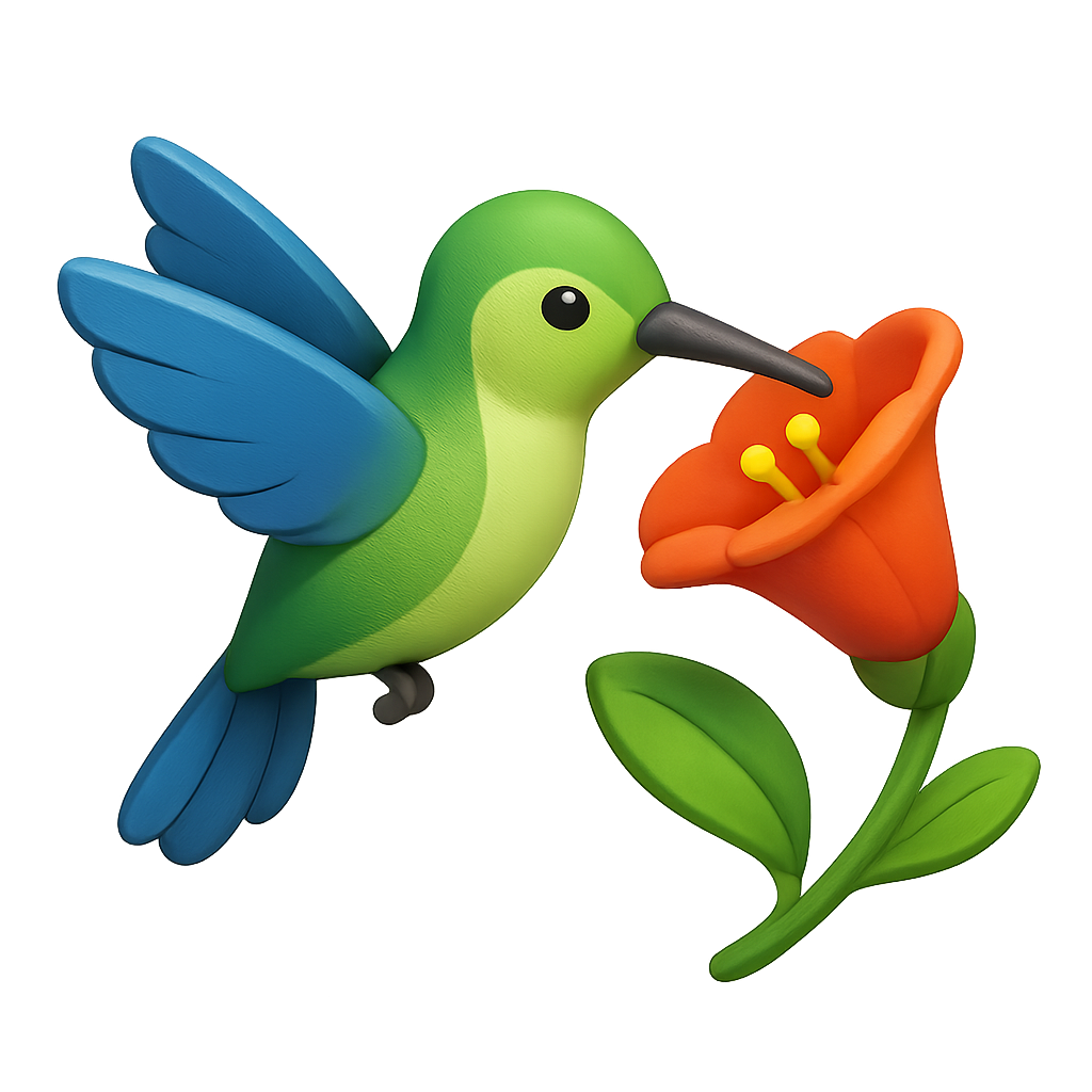 A vibrant 3D icon of a hummingbird hovering near a bright flower. The design features a three-quarter view with a transparent background, showcasing a playful and volumetric style.