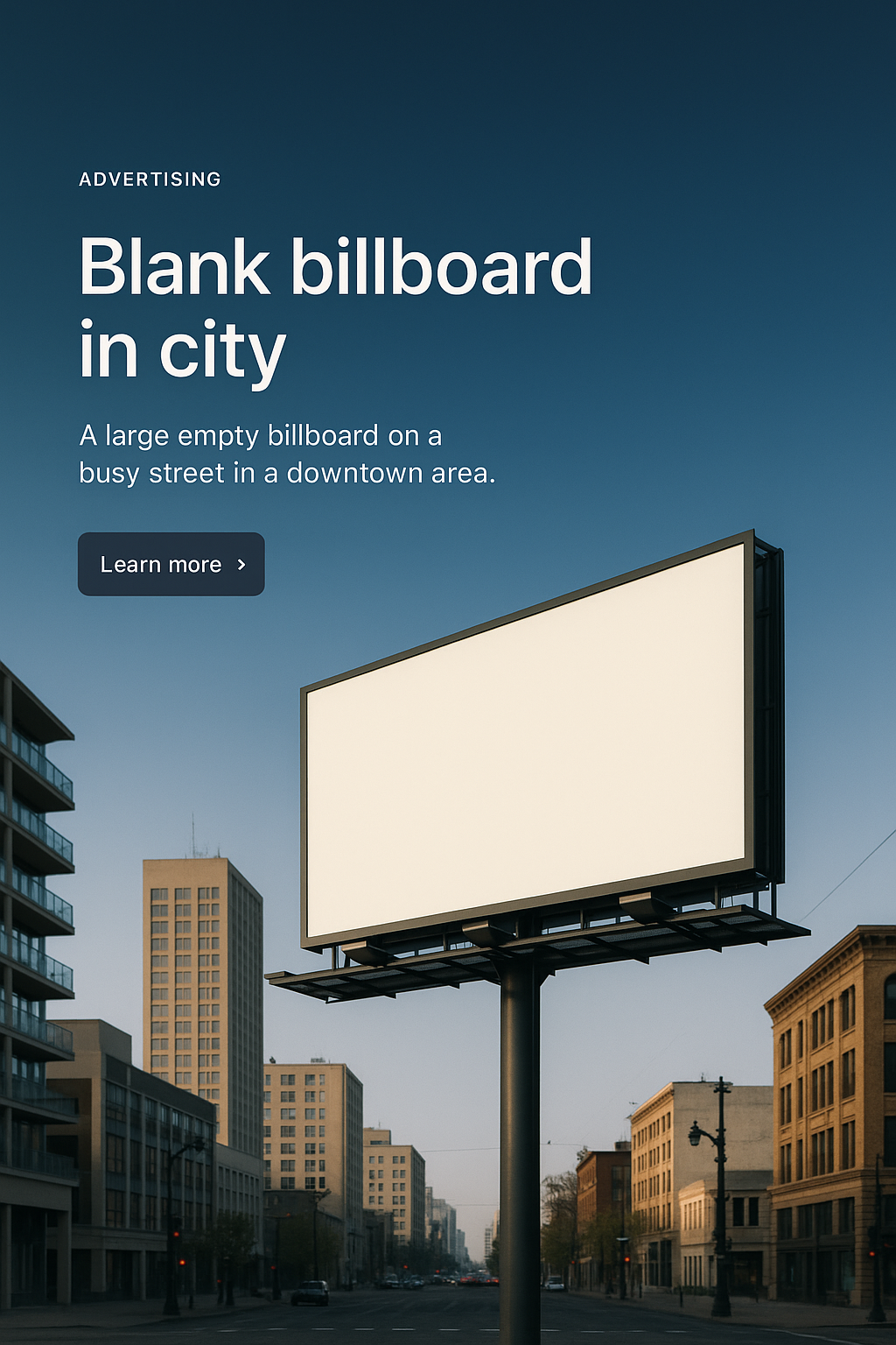 A blank billboard stands prominently in a cityscape, ready for advertising. The scene features a modern urban environment with buildings lining a quiet street.