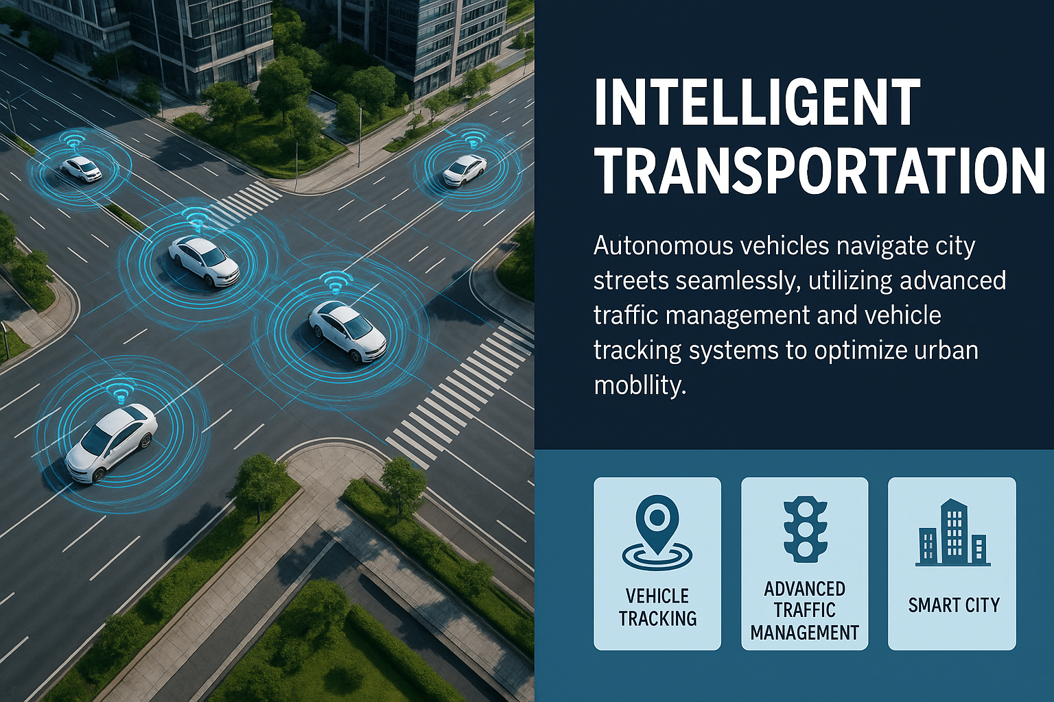 /Collection: /by davooda/Type: PNG/An infographic illustrating the concept of intelligent transportation in urban settings. It features autonomous vehicles and advanced traffic management systems, designed for educational or promotional use in urban planning.