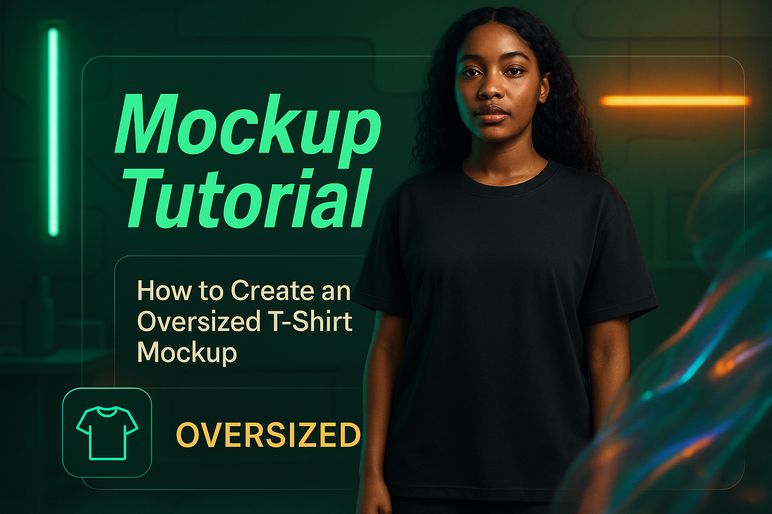 Engaging graphic designed for a tutorial on creating oversized t-shirt mockups, featuring a model in a black t-shirt. Ideal for fashion design or e-commerce education.