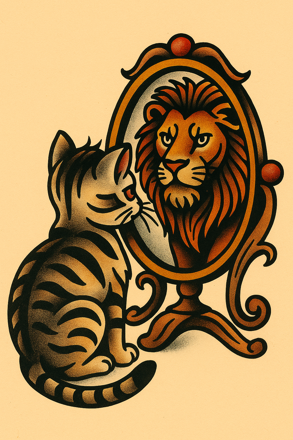 Kitten Gazing at Its Lion Reflection in a Tattoo Style