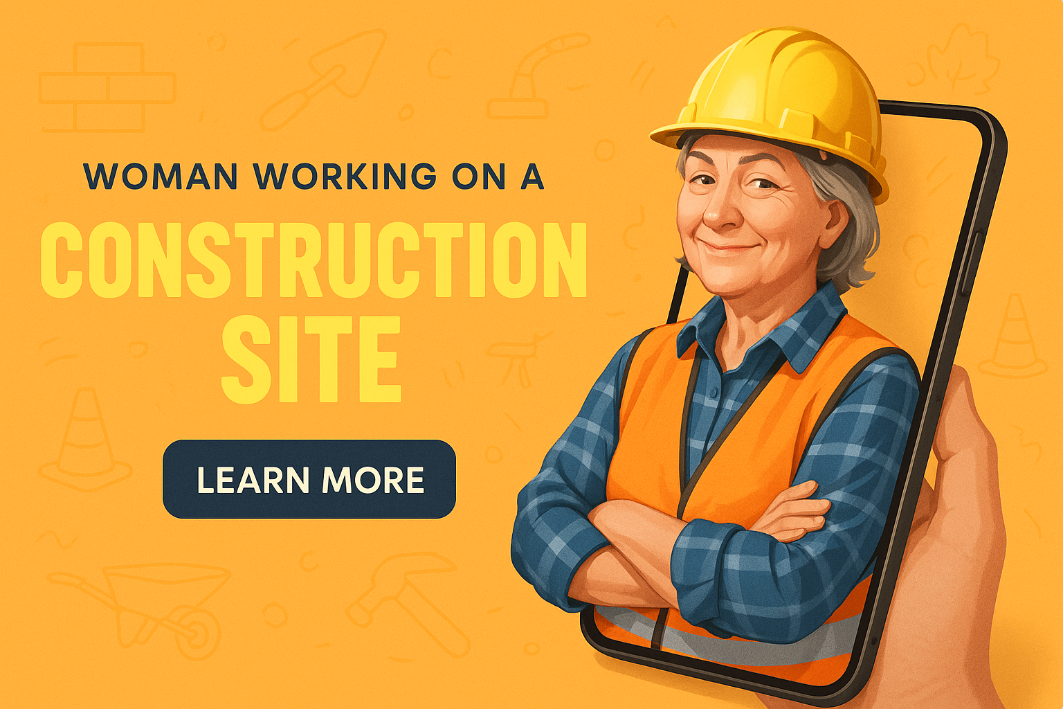 /Collection: /by davooda/Type: PNG/A modern advertisement showcasing a middle-aged woman in a hard hat and vest, emerging from a smartphone. The playful layout features bold typography and a vibrant background.