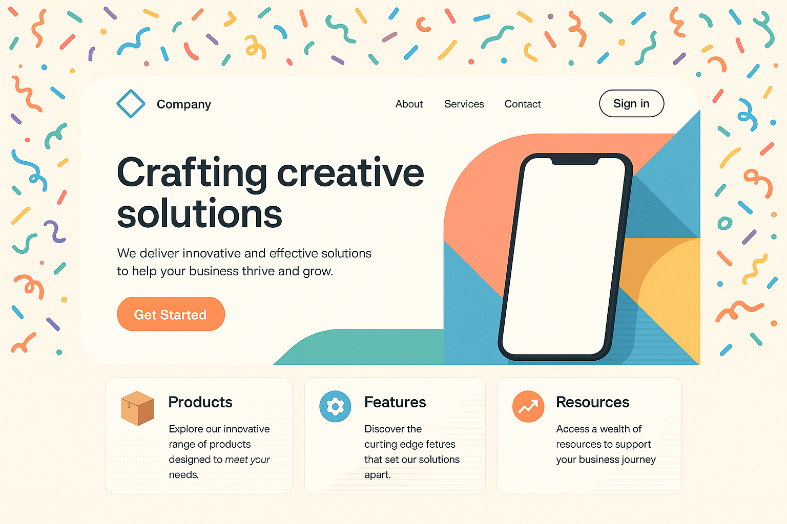 /Collection: /by davooda/Type: PNG/A visually engaging landing page layout featuring a smartphone mockup, colorful geometric shapes, and sections for products, features, and resources, complemented by playful confetti.