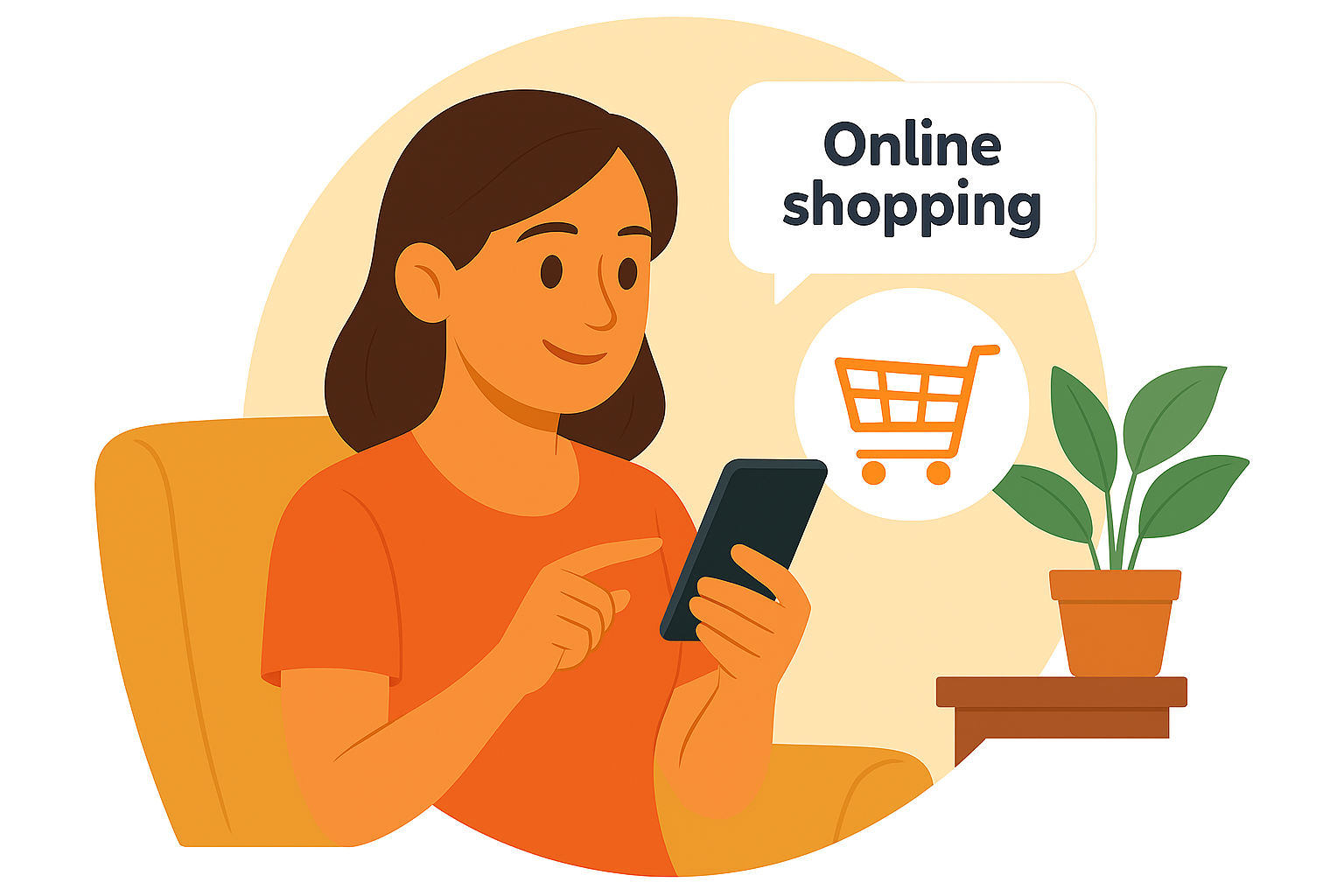 /Collection: /by davooda/Type: PNG/A vibrant illustration depicting a user engaging in online shopping on a smartphone. The design features soft colors and a friendly character, making it suitable for e-commerce websites or marketing materials.