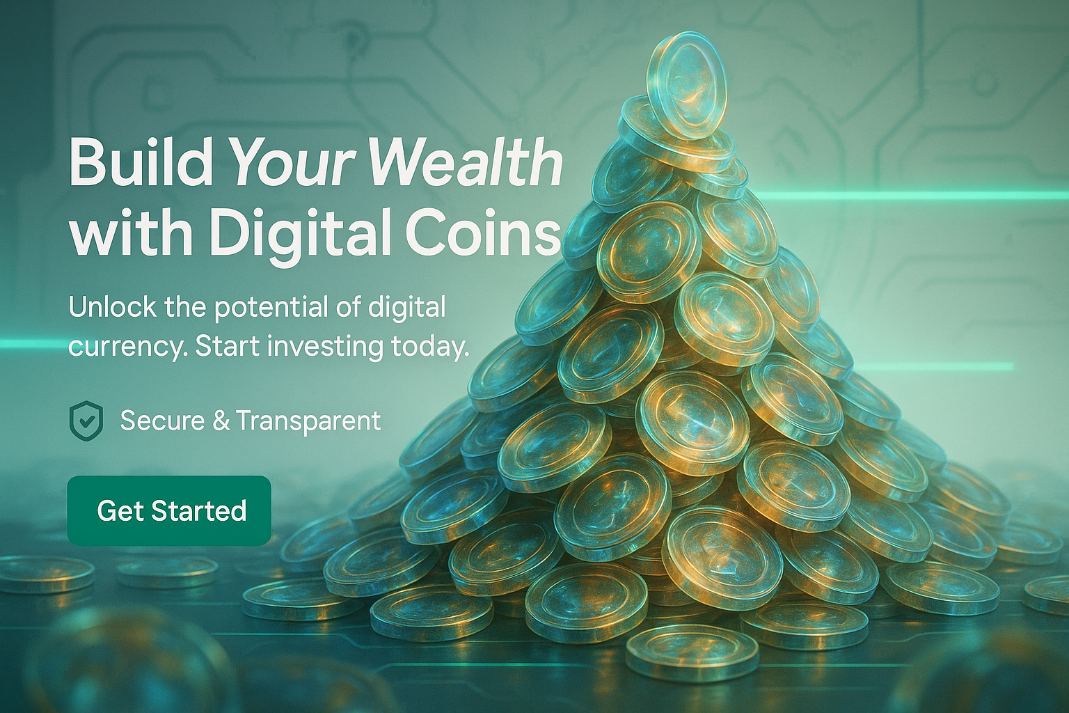 /Collection: /by davooda/Type: PNG/Engaging promotional graphic depicting a pyramid of digital coins, emphasizing investment in cryptocurrency with a modern and sleek design, aimed at potential investors.