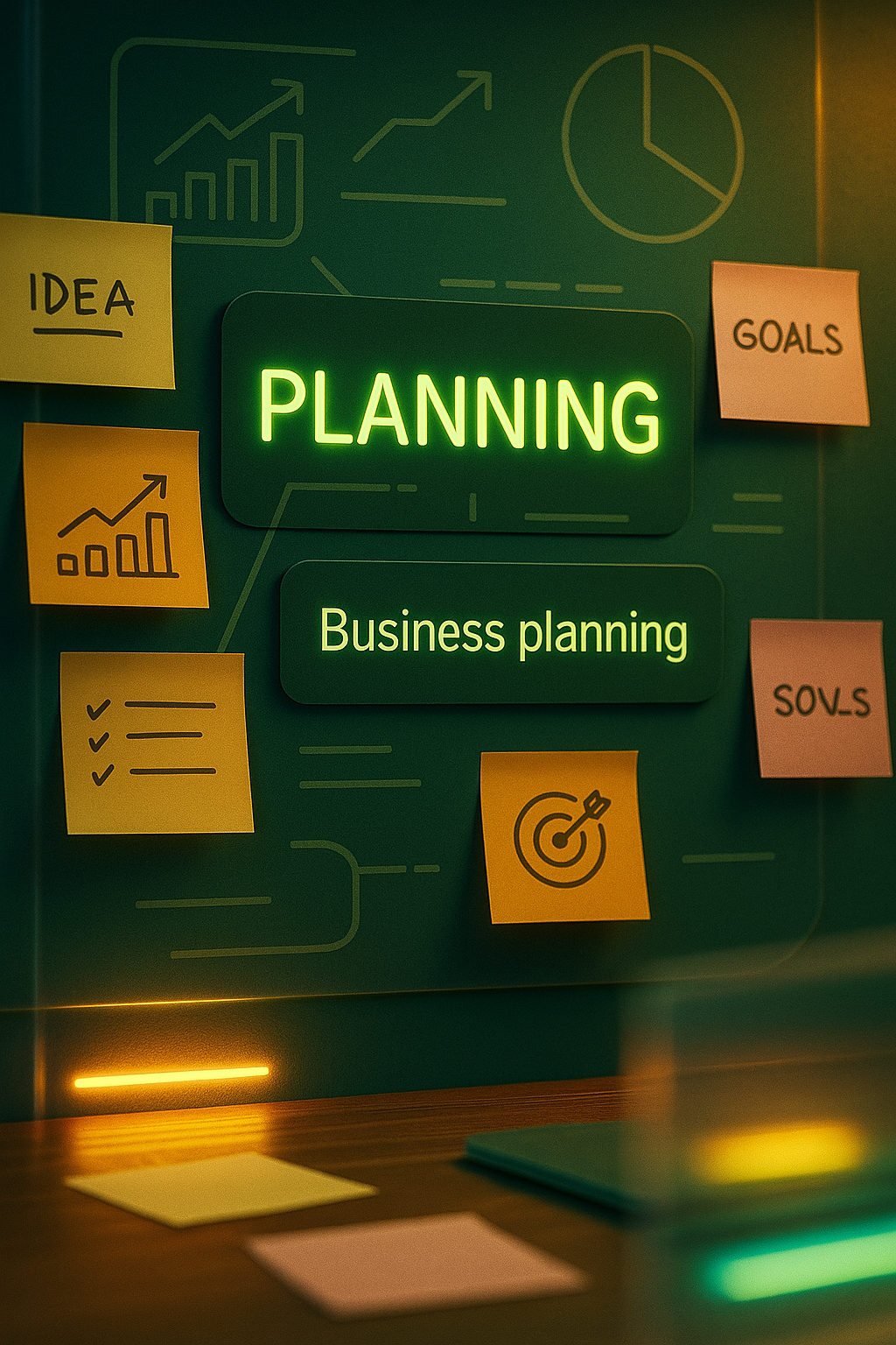 A vibrant graphic representing business planning, featuring neon text and colorful sticky notes. Ideal for presentations or articles on strategic planning.