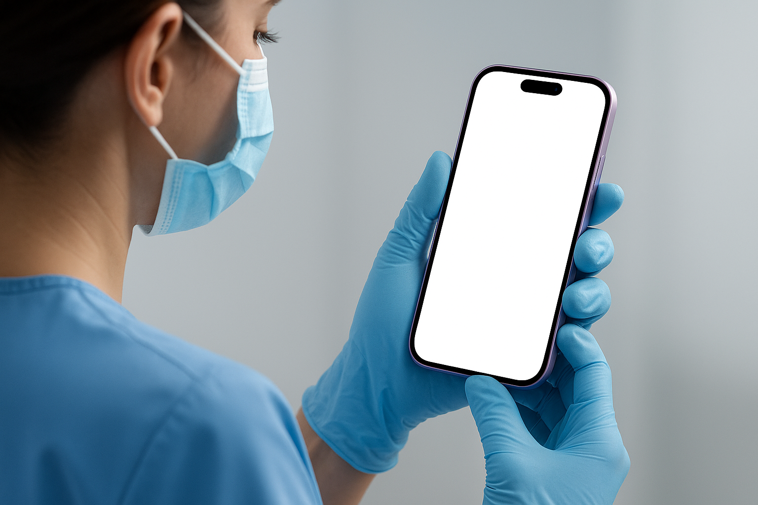 A nurse in a blue uniform and mask holds a purple phone with a blank screen. The image captures her from behind, focusing on her gloved hands and the phone, emphasizing a sterile environment.