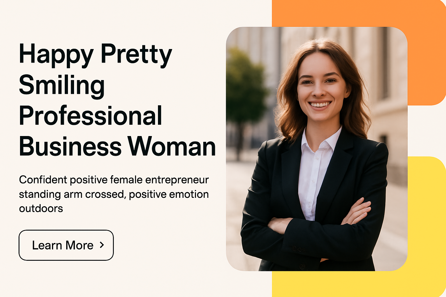 /Collection: /by davooda/Type: PNG/A confident young businesswoman smiles with arms crossed outdoors, set against a bright geometric background. The design features bold typography and a clear call-to-action.