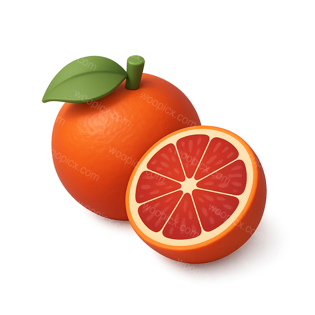 /Premium/Collection: /by davooda/Type: PNG/A vibrant 3D representation of a blood orange, displayed in a three-quarter view. The icon features a whole fruit alongside a sliced segment, showcasing its juicy red interior. A green leaf adds a touch of realism.