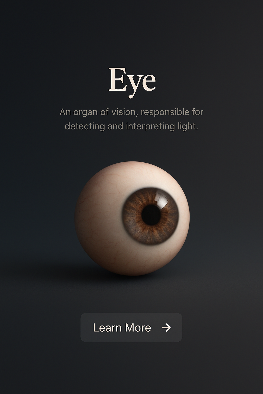 /Collection: /by davooda/Type: PNG/A detailed 3D representation of an eye set against a dark gradient background. Features a small label and informative text with a 'Learn More' button, all designed for clarity and visual appeal.