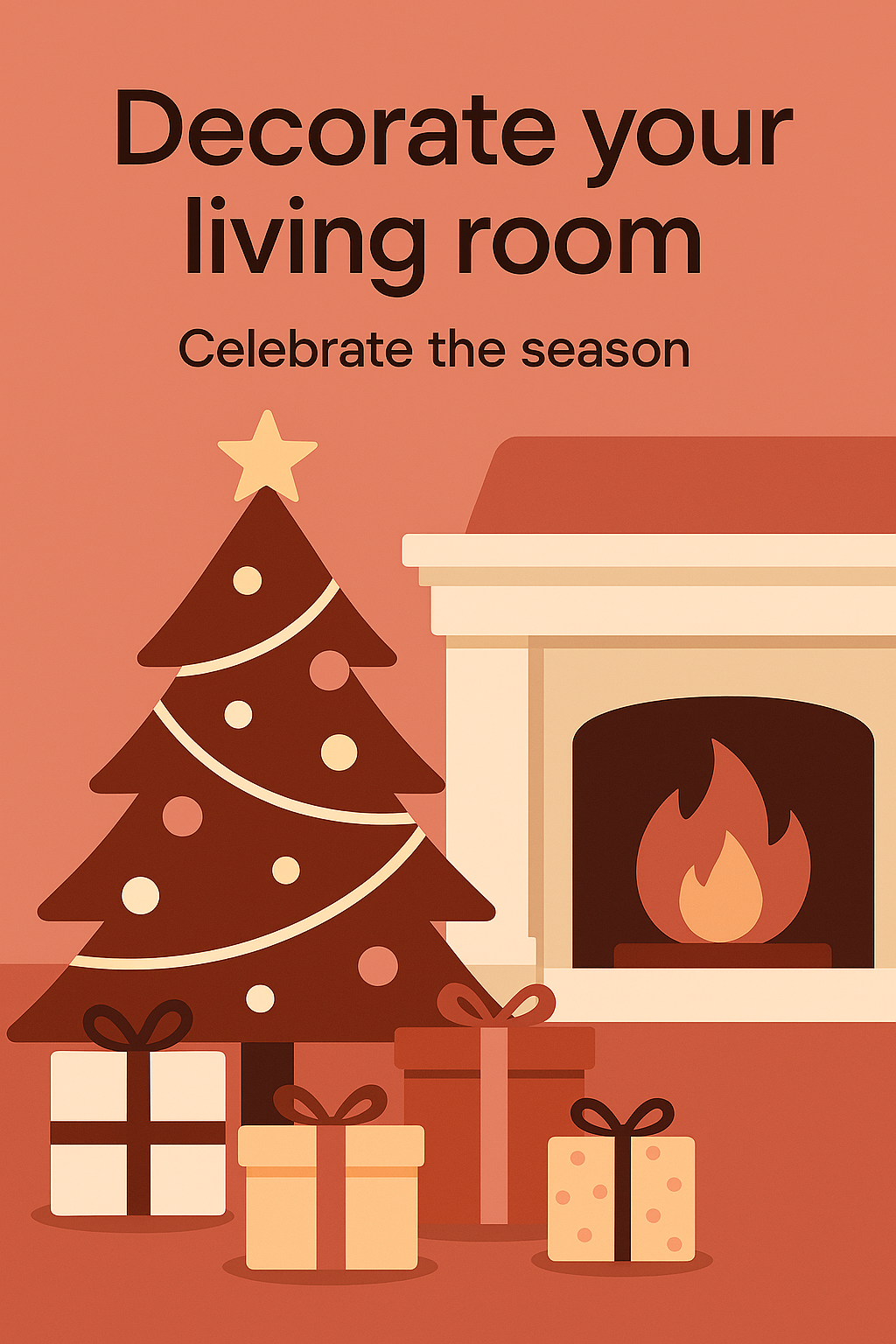Charming illustration depicting a decorated Christmas tree, gifts, and a cozy fireplace, ideal for seasonal marketing and festive decor inspiration.