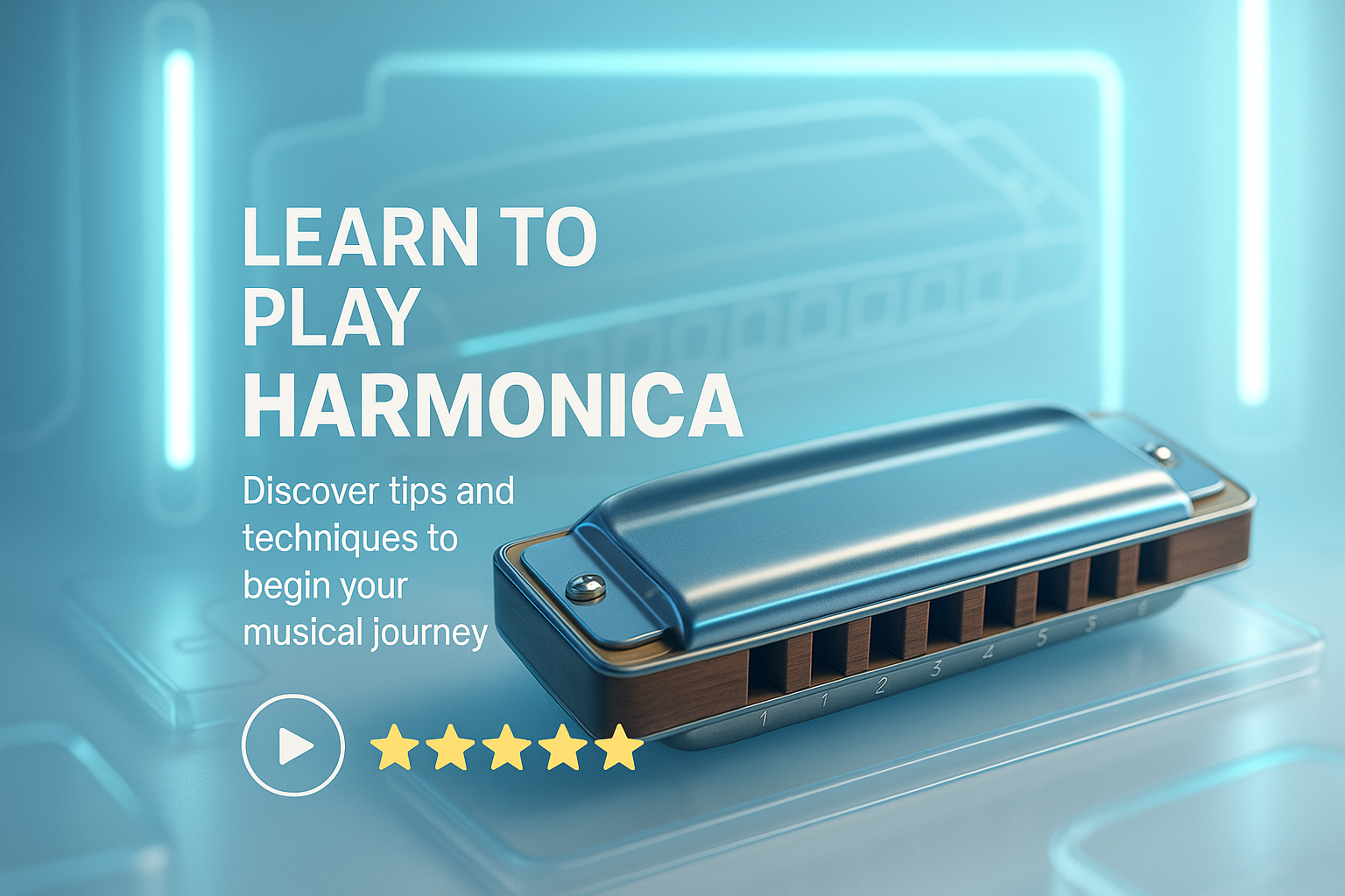 Engaging promotional image designed for a harmonica learning program, featuring a sleek harmonica with a modern background, ideal for music enthusiasts.