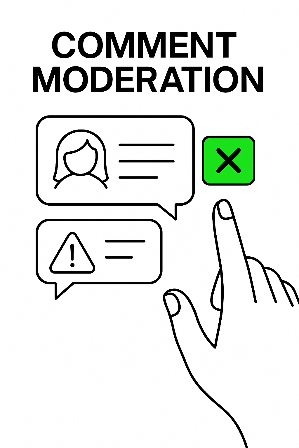 /Collection: /by davooda/Type: PNG/Vector illustration depicting the comment moderation process, featuring a hand gesture interacting with comment bubbles, suitable for social media and digital content guidelines.