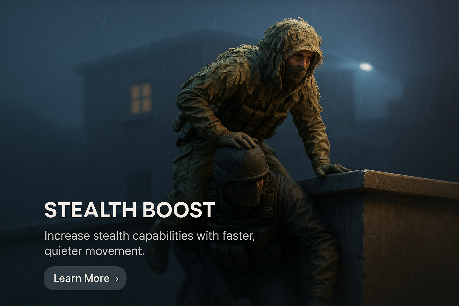 /Collection: /by davooda/Type: PNG/A detailed 3D scene showcasing a stealth boost theme with two figures in a dimly lit environment. The text highlights faster, quieter movement with a clear call to action.