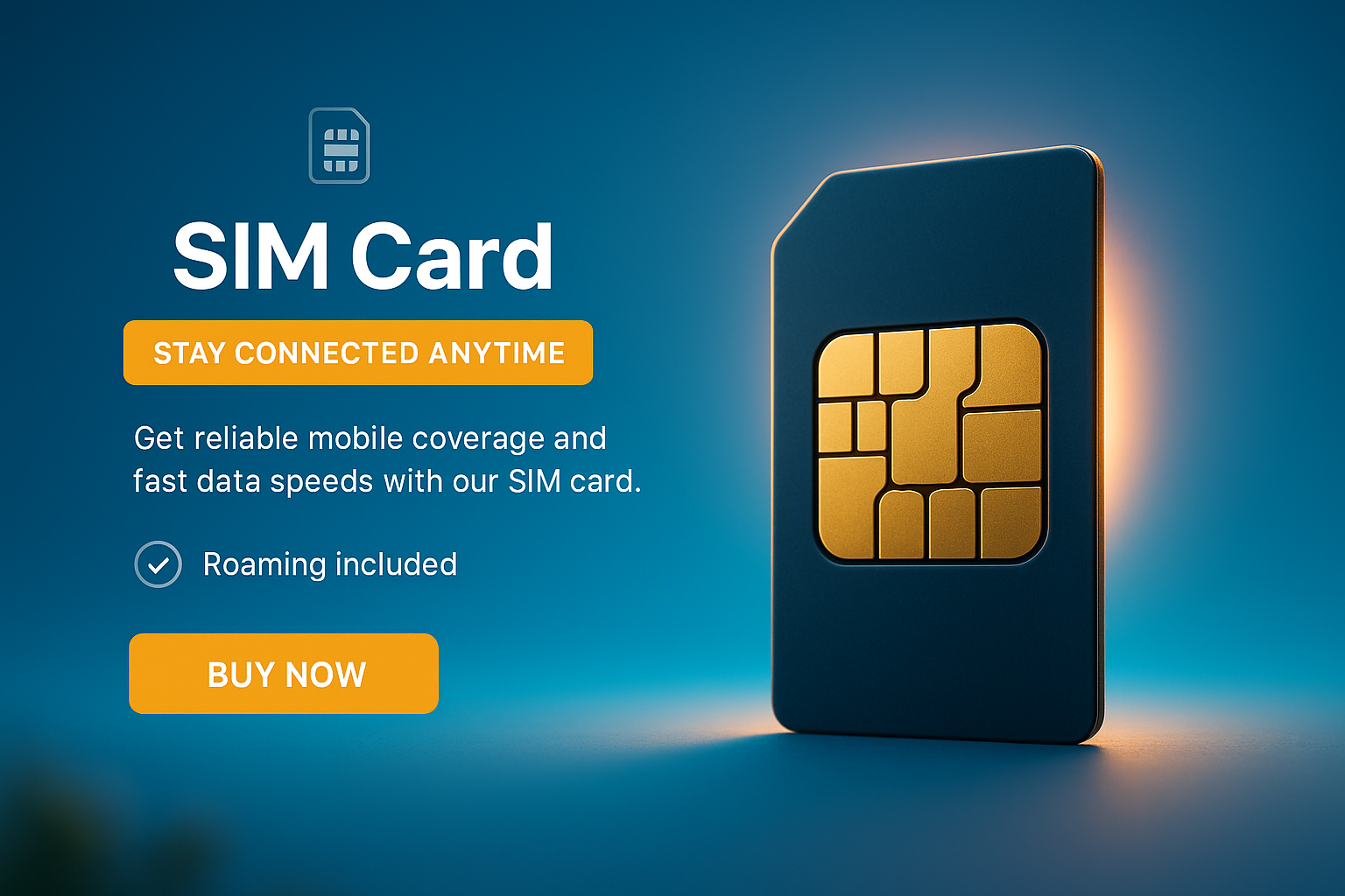 A digital advertisement showcasing a SIM card with a call-to-action button. The design features a modern and sleek aesthetic, aimed at mobile users seeking connectivity.