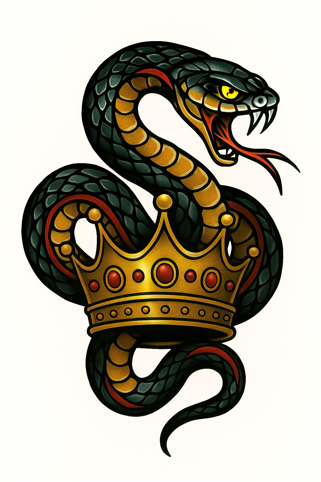 This graphic features a stylized snake coiled around a regal crown, showcasing bold colors and intricate details. Ideal for tattoo design or merchandise.