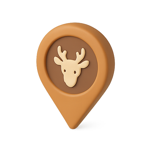 A creative location pin icon featuring a stylized deer head design, suitable for apps or websites focused on wildlife or nature themes. The earthy color palette adds warmth.