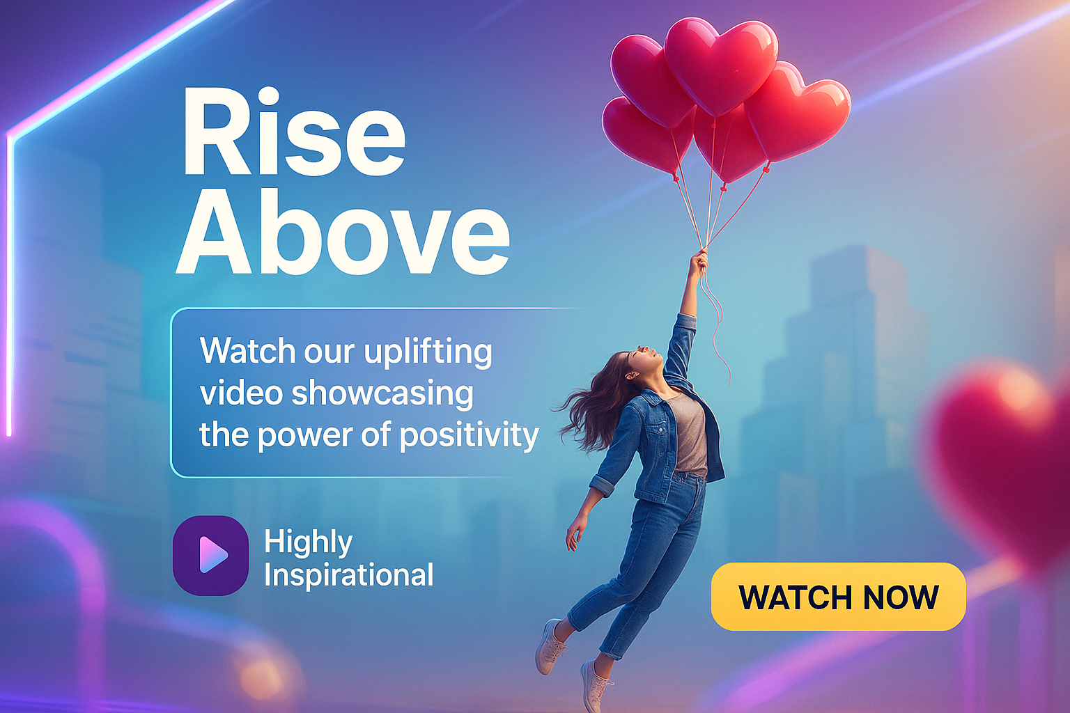 A vibrant promotional banner showcasing a woman floating with heart balloons, effectively conveying a message of positivity and inspiration. Ideal for social media or video marketing.