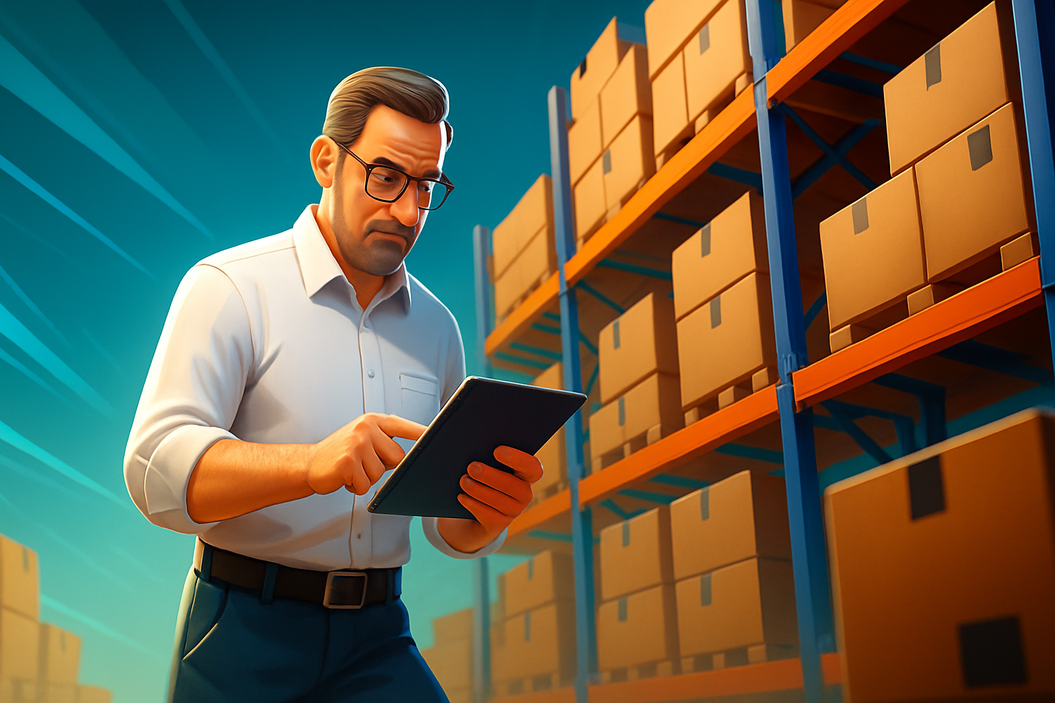 This digital illustration depicts a warehouse manager using a tablet while surrounded by shelves of boxes. It conveys themes of efficiency and organization in logistics.