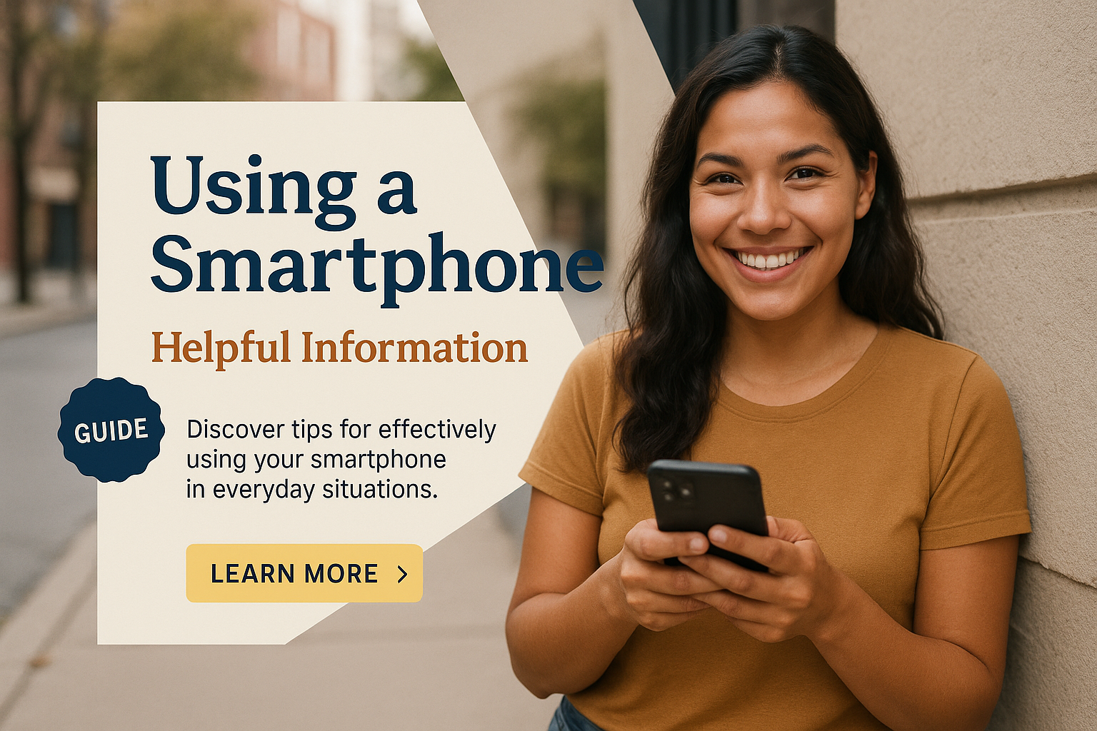 /Collection: /by davooda/Type: PNG/A Latin American woman smiles while using her smartphone, set against a blurred urban backdrop. The image features a harmonious color scheme and engaging design elements.