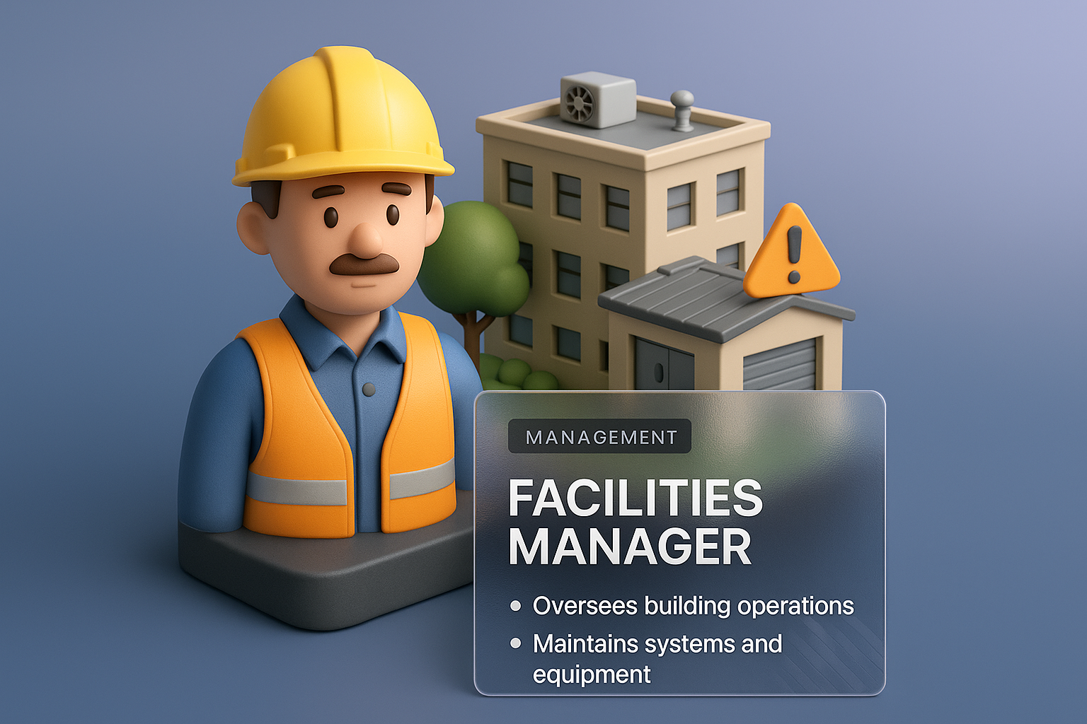 /Collection: /by davooda/Type: PNG/A vibrant 3D illustration depicting a facilities manager with safety gear, overseeing a building. The design features a clear label highlighting the role and responsibilities.