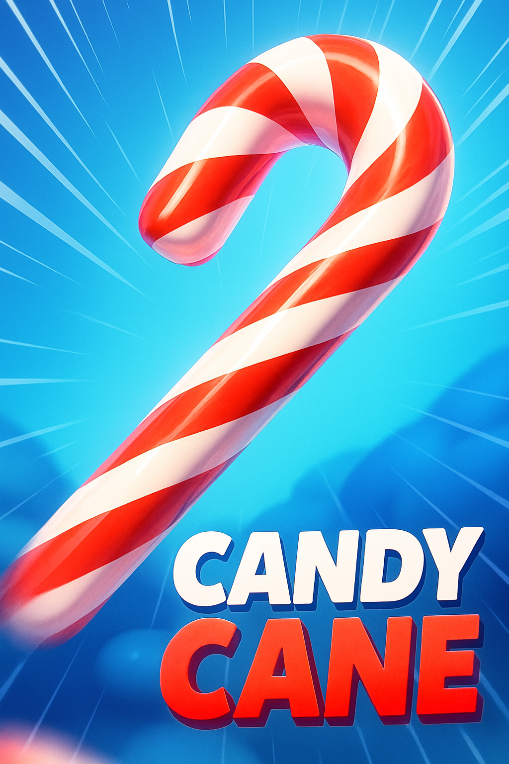 A vibrant and dynamic close-up of a candy cane, featuring bold typography that emphasizes its playful nature. The background transitions smoothly, enhancing the overall visual appeal.